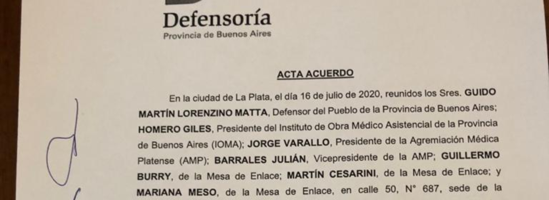 En una mediación convocada por el Defensor del Pueblo de la provincia de Buenos Aires, Guido Lorenzino, la Agremiación Médica Platense (AMP) y la obra social IOMA firmaron un acta en la que se comprometieron a mantener la vigencia del convenio actual entre las partes y a discutir uno nuevo en un plazo de 60 días.