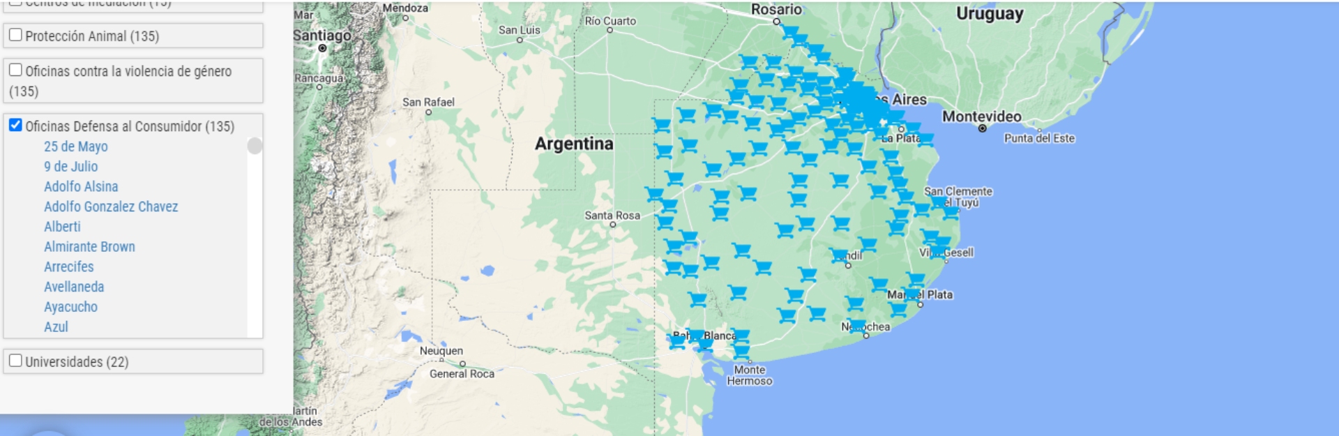 Gracias al trabajo del área de Consumidores y Consumidoras del organismo que conduce Guido Lorenzino, este mapa se va nutriendo periódicamente con los datos y referencias de cada una de las oficinas municipales en donde las y los vecinos pueden acercarse y reclamar ante cualquier tipo de incumpliendo en las relaciones comerciales.