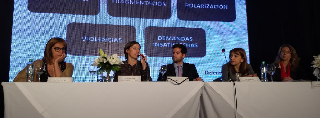 En el panel sobre el modelo de cooperación de la mediación comunitaria, Dolores Ayerdi, coordinadora de Gestión de Conflictos de la Defensoría habló sobre las políticas públicas orientadas a la prevención de la violencia en los conflictos sociales urbanos, entre las cuales la implementación de la mediación comunitaria y los métodos participativos de abordaje de conflictos en general constituyen un valioso aporte a la construcción de una sociedad más democrática, más justa y más pacífica en la gestión de sus conflictos.